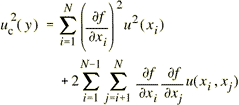 Equation (6) is based on a first-order Taylor series approximation of the measurement equation Y = f(X1, X2, . . . , XN) given in equation (1) and is conveniently referred to as the law of propagation of uncertainty. The partial derivatives of f with respect to the Xi (often referred to as sensitivity coefficients) are equal to the partial derivatives of f with respect to the Xi evaluated at Xi = xi; u(xi) is the standard uncertainty associated with the input estimate xi; and u(xi, xj) is the estimated covariance associated with xi and xj. Simplified forms |